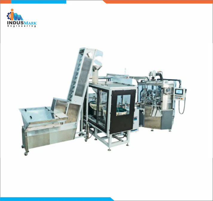 High speed fully automatic machine to decorate periphery of synthetic corks using dry offset technology to print up to 2 colours.